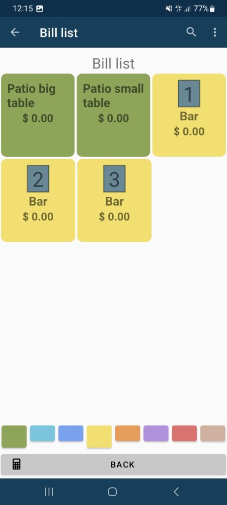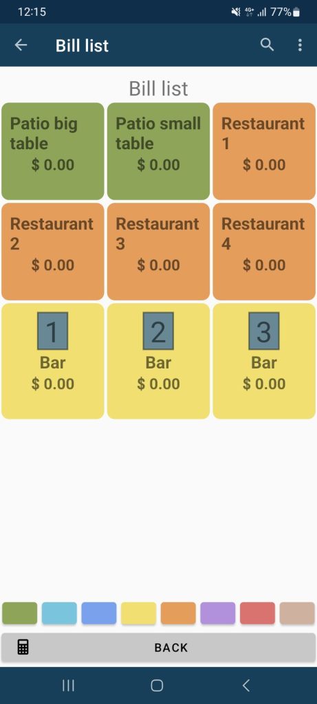In the bill list, each bill will be displayed with its color tag, helping you quickly distinguish indoor tables, outdoor seating, the bar, or any other area of your venue.